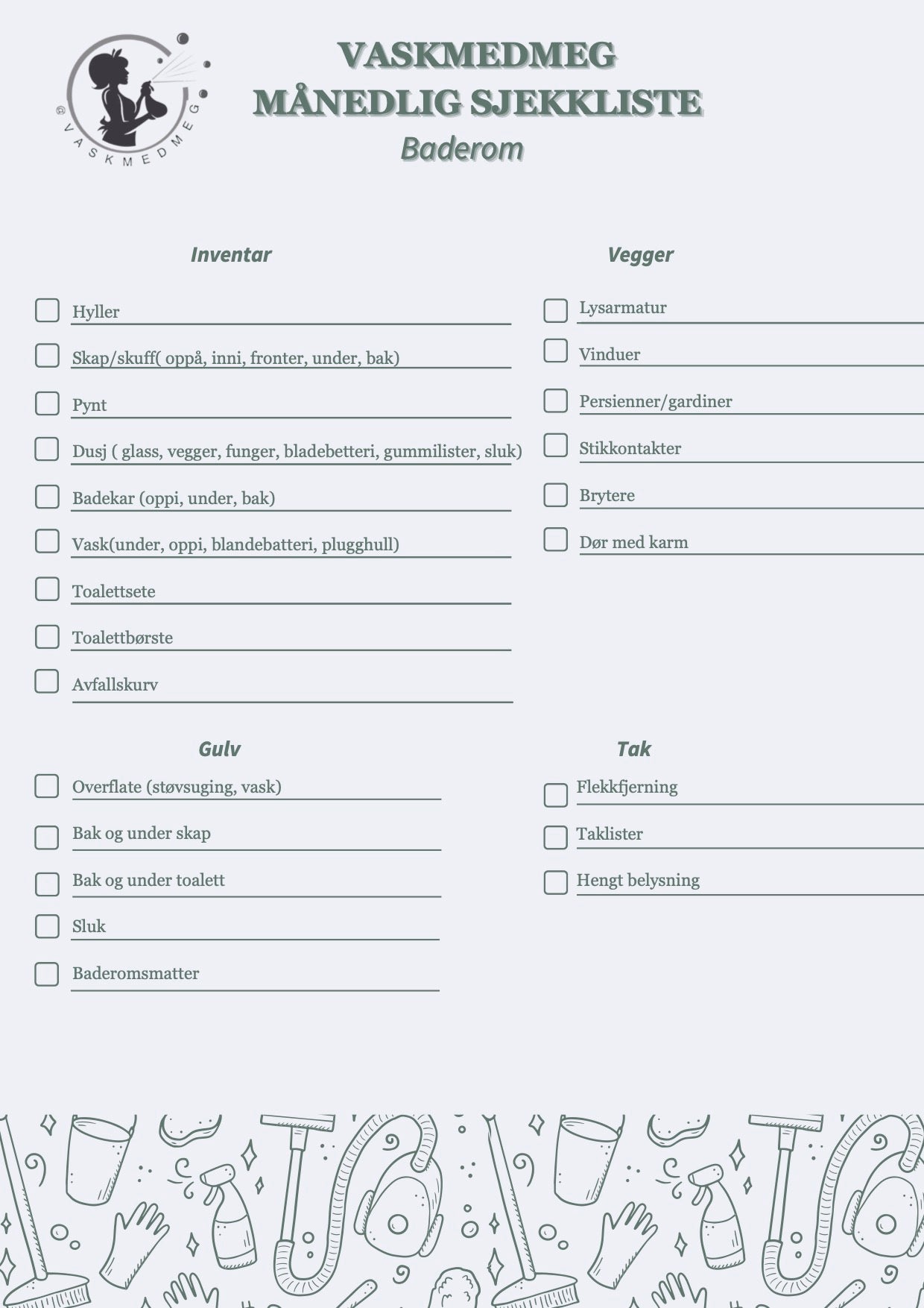 Ikke la smusset bygge seg opp! Sjekker du en gang i måned om det som står på lista har behov for en vask, jeg garanterer deg at du skal få disse oppgaver krysset av på null komma niks!