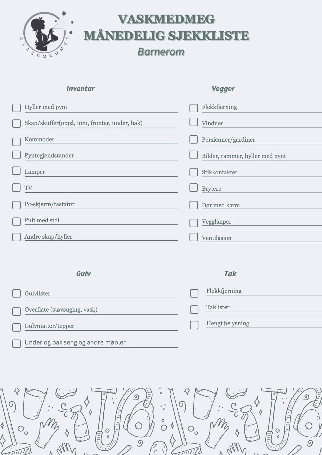 Ikke la smusset bygge seg opp! Sjekker du en gang i måned om det som står på lista har behov for en vask, jeg garanterer deg at du skal få disse oppgaver krysset av på null komma niks!