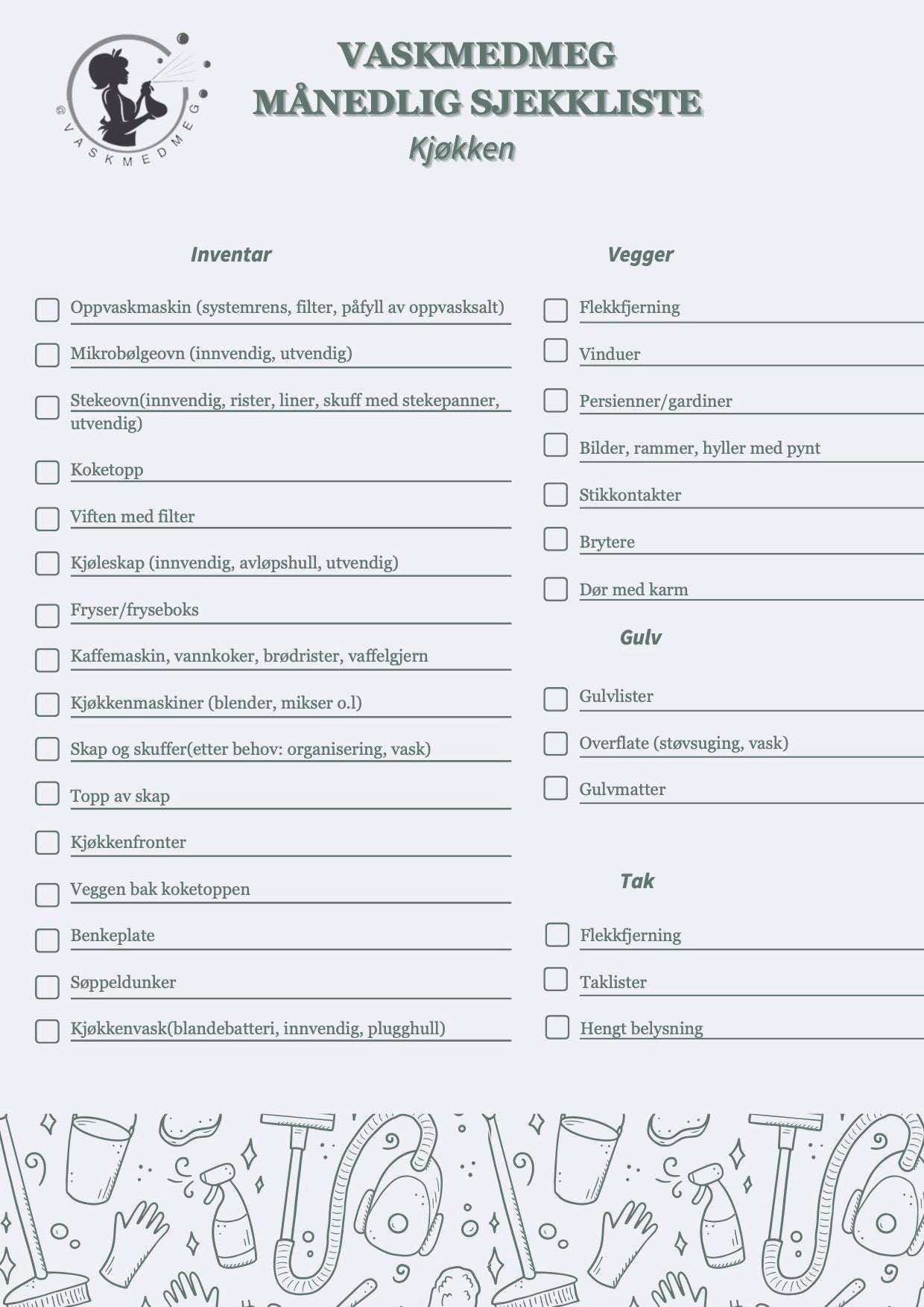 Ikke la smusset bygge seg opp! Sjekker du en gang i måned om det som står på lista har behov for en vask, jeg garanterer deg at du skal få disse oppgaver krysset av på null komma niks!