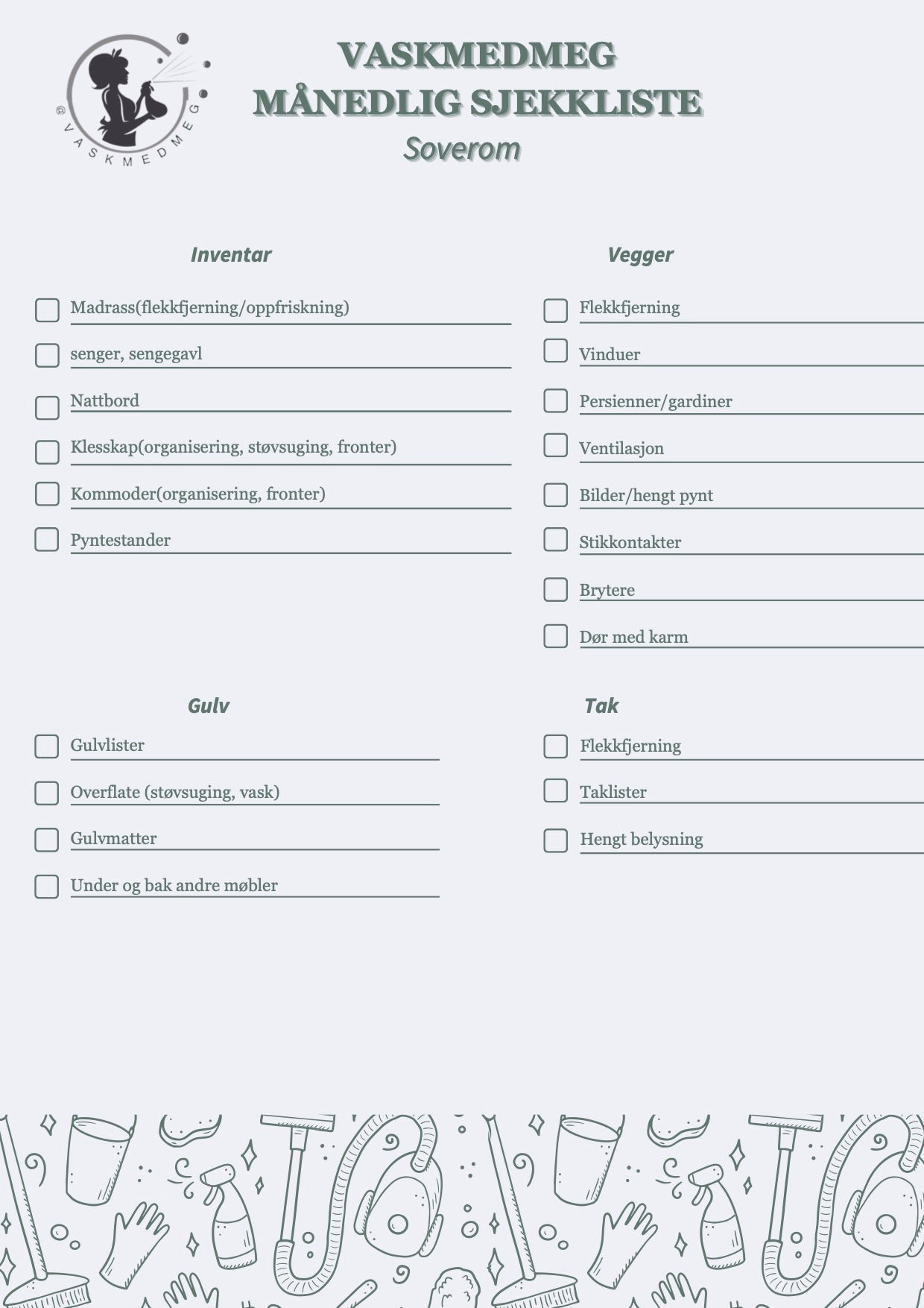 Ikke la smusset bygge seg opp! Sjekker du en gang i måned om det som står på lista har behov for en vask, jeg garanterer deg at du skal få disse oppgaver krysset av på null komma niks!