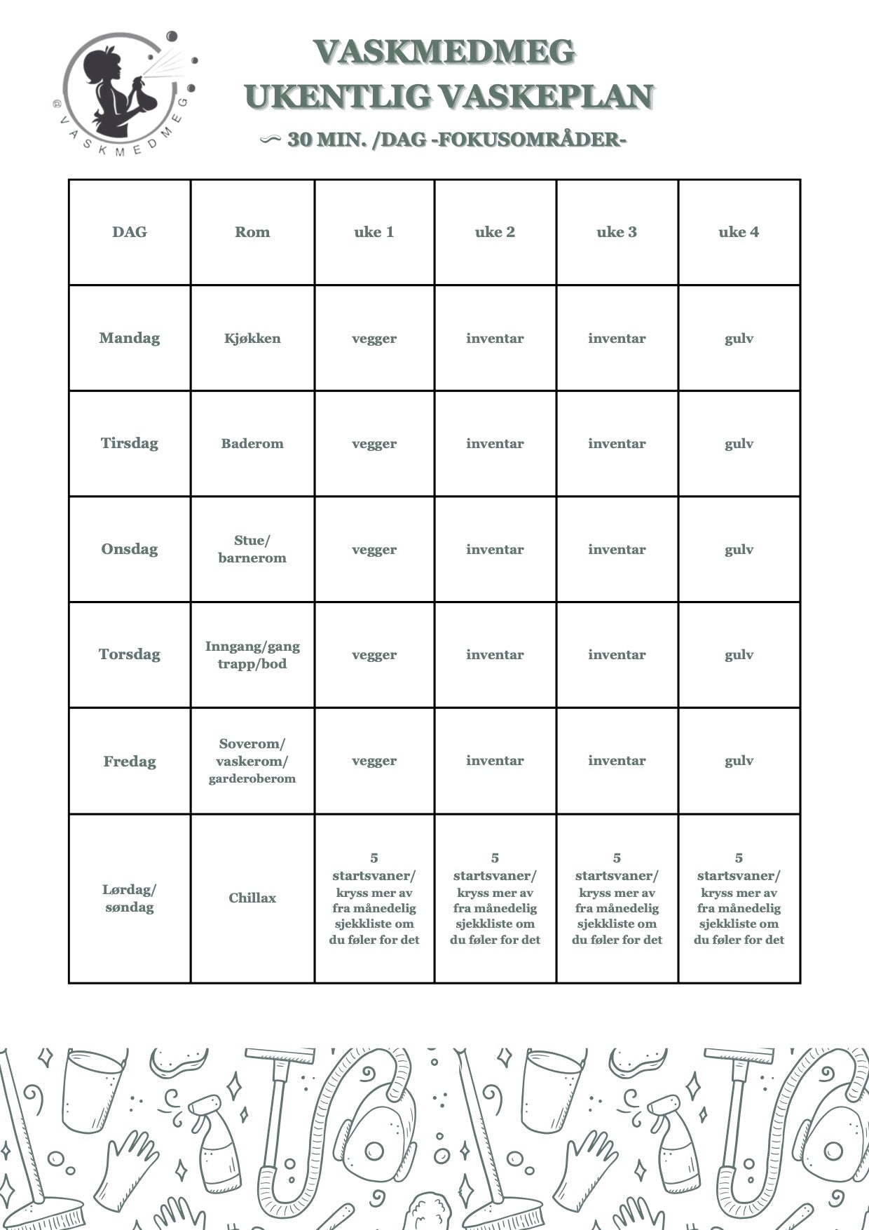 Planen som hjelper deg bytte vaskemønstrene dine. Gå fra reaksjonsbasert vasking til planlagt proaktiv vasking ved å følge det samme planlagt rutine, dag for dag, rom for rom.